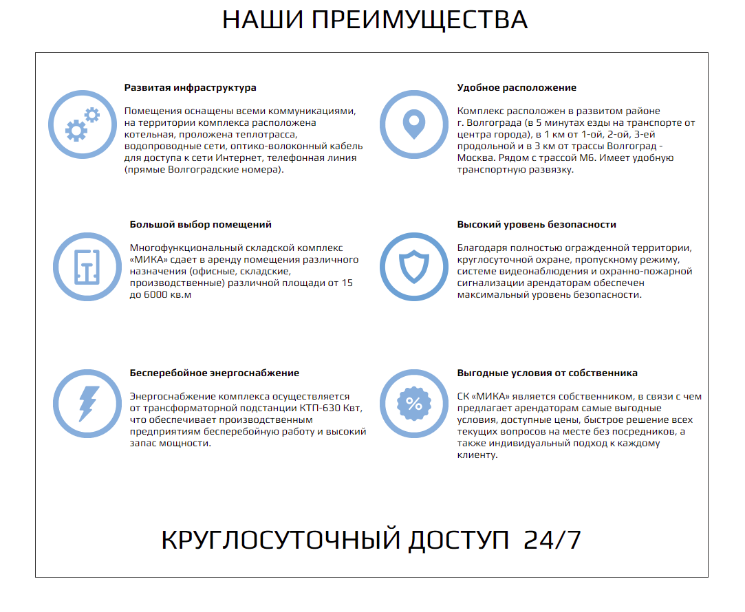 Большой выбор складских помещений различной площади в аренду от одного из крупнейших комплексов г. Волгограда - собственника СК «МИКА». Потенциальным арендаторам гарантированы выгодные условия, удобное расположение, развитая инфрастуктура и доступные цены.